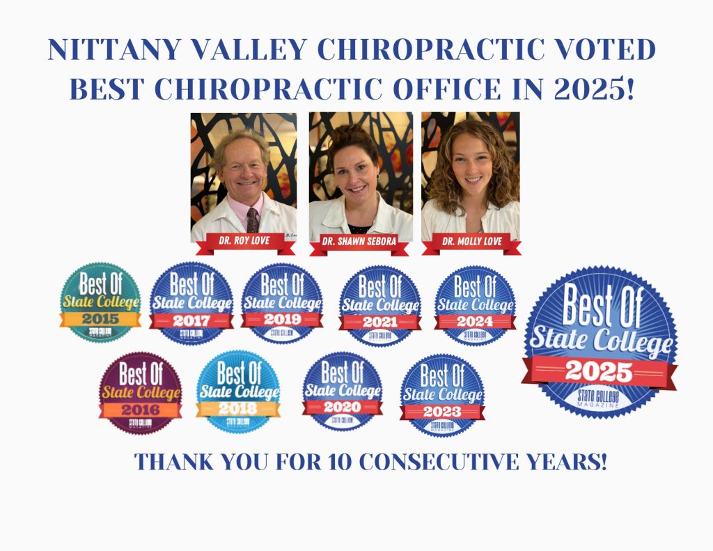Nittany Valley Chiropractic Center provides comprehensive chiropractic treatment, which includes manipulation of the spine and extremities, therapies, specific exercise prescription, rehab therapy, and nutritional advice to patients in the Centre Region of PA. Our four doctors, Dr. Roy Love, Dr. Shawn Sebora and Dr. Molly Loveshare over 60+ years of experience. We are proud to offer state of the art care for your health problem and pledge to return you to better health and function as quickly as possible. We have two offices, one in State College and one in Spring Mills. With the use of advanced sports injury treatments, rehab techniques, massage, acupuncture and chiropractic treatment we are proud of our excellent outcomes and a quick return to health for our patients. Over time, we’ve built a loyal large patient base providing excellent customer service and individualized treatment to each person who we welcome into our offices.
